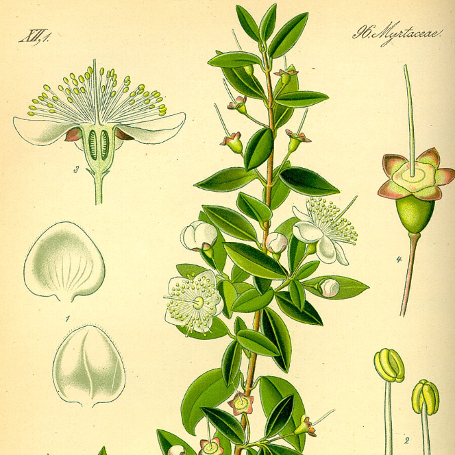 Les feuilles de Myrte officinale sont traditionnellement utilisées pour leurs propriétés antiseptiques sur différentes sphère (pulmonaire, urinaire et digestive) en cas de: